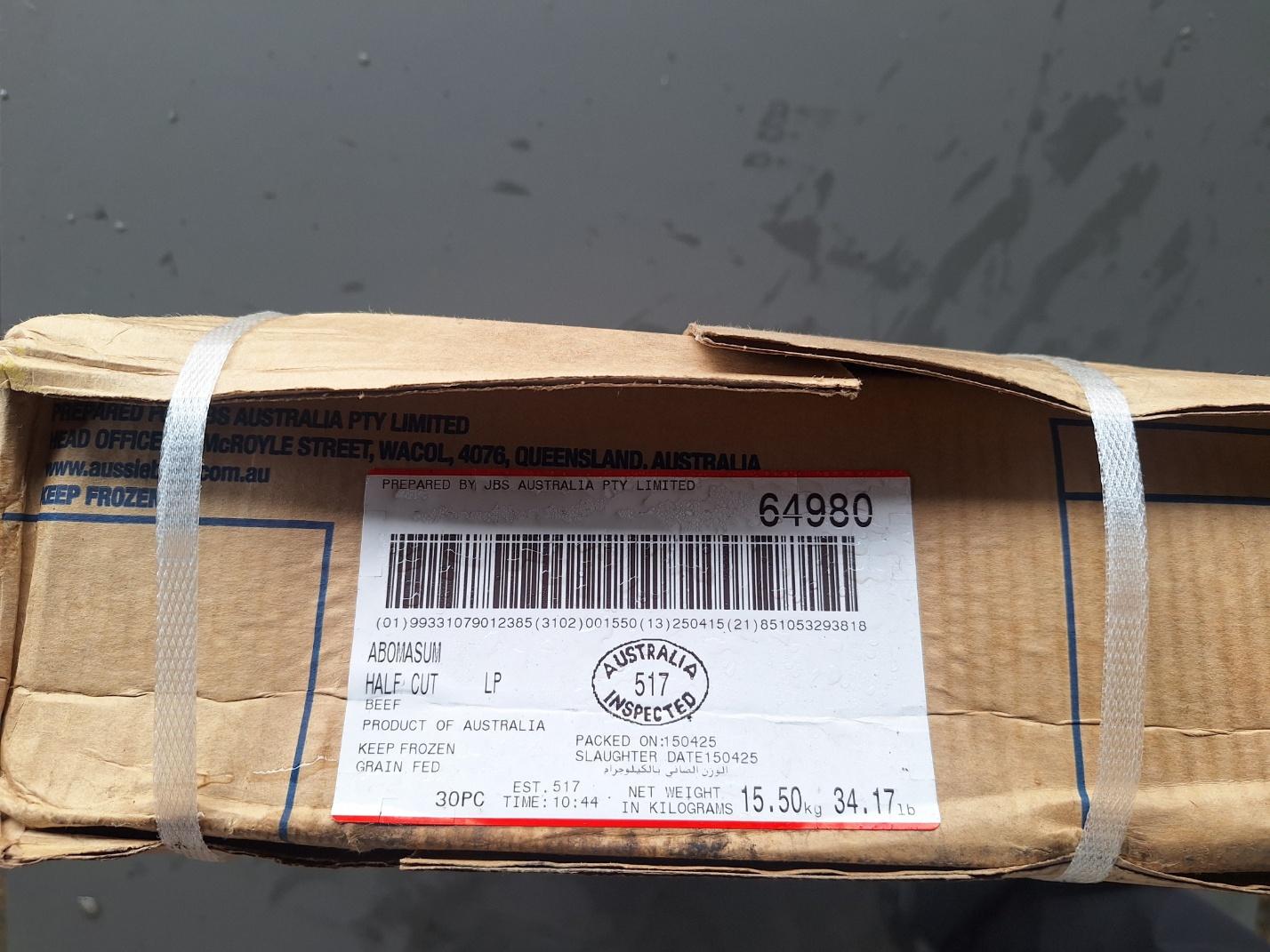 박스 측면 라벨에는 제품명, 원산지, 포장일자, 중량 등이 표시되어 있으며,